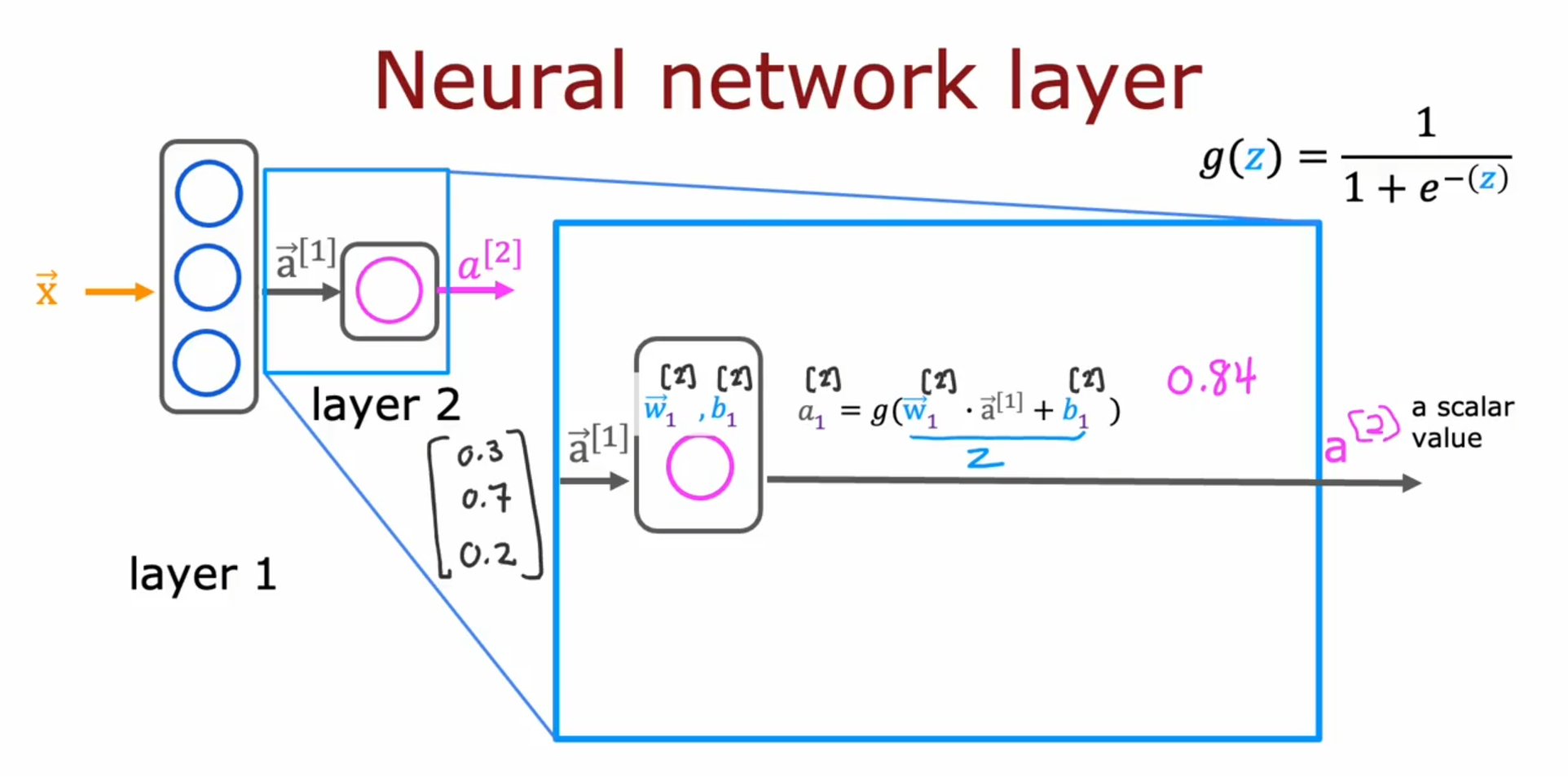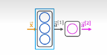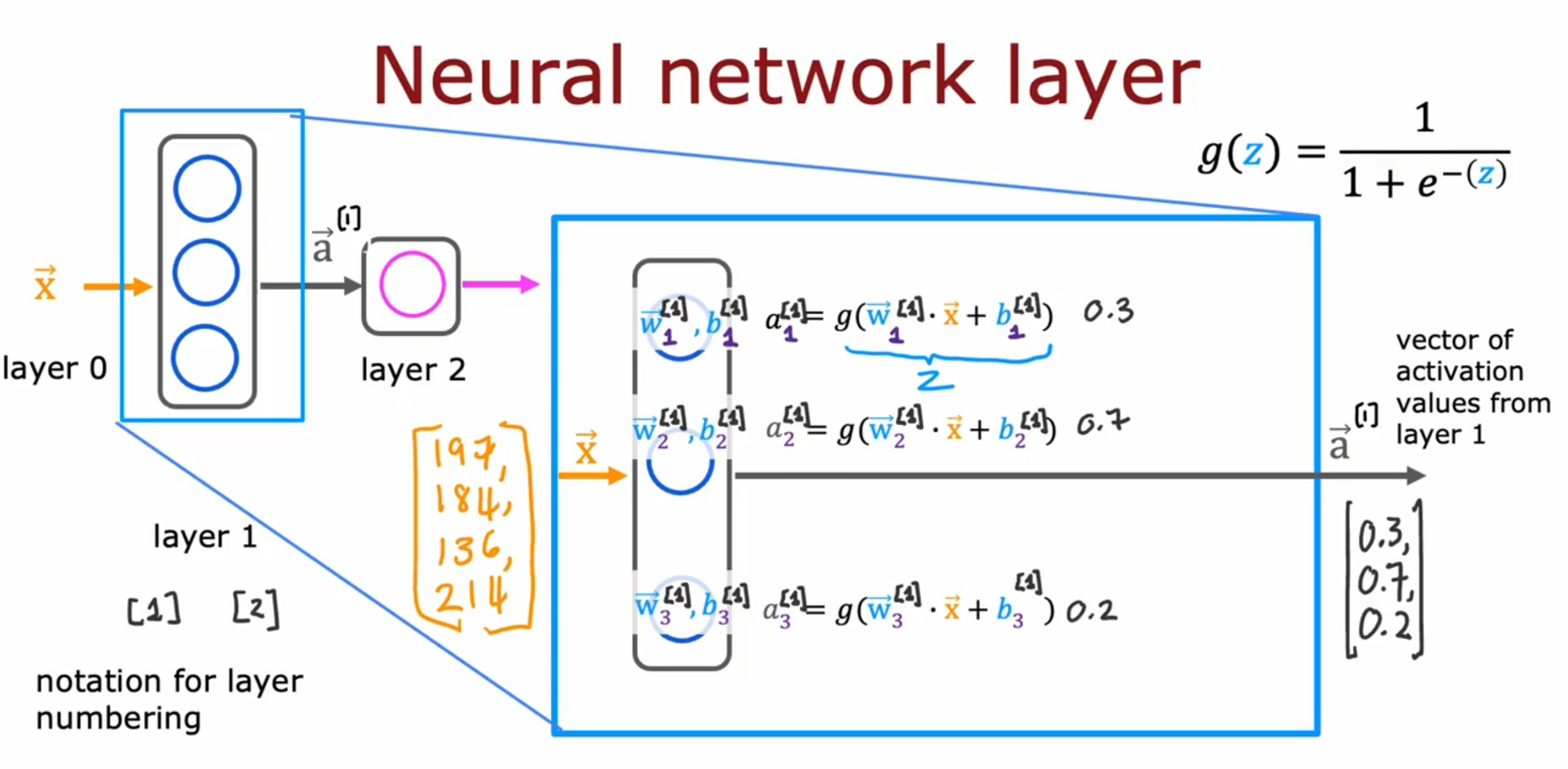 现在有一个神经网络,我们将向量作为输入值输入,在第一层神经网络中进行计算。在第一层中有三个神经元,这三个神经元每一个都可以实现一个小型的逻辑回归单元,每一个神经元都有两个参数:和,它们的作用是输出一些激活值,其中表示sigmoid函数。为了方便我们将第一个神经元的参数以及输出的激活值表示为,以此类推,最终得到该层的输出值。