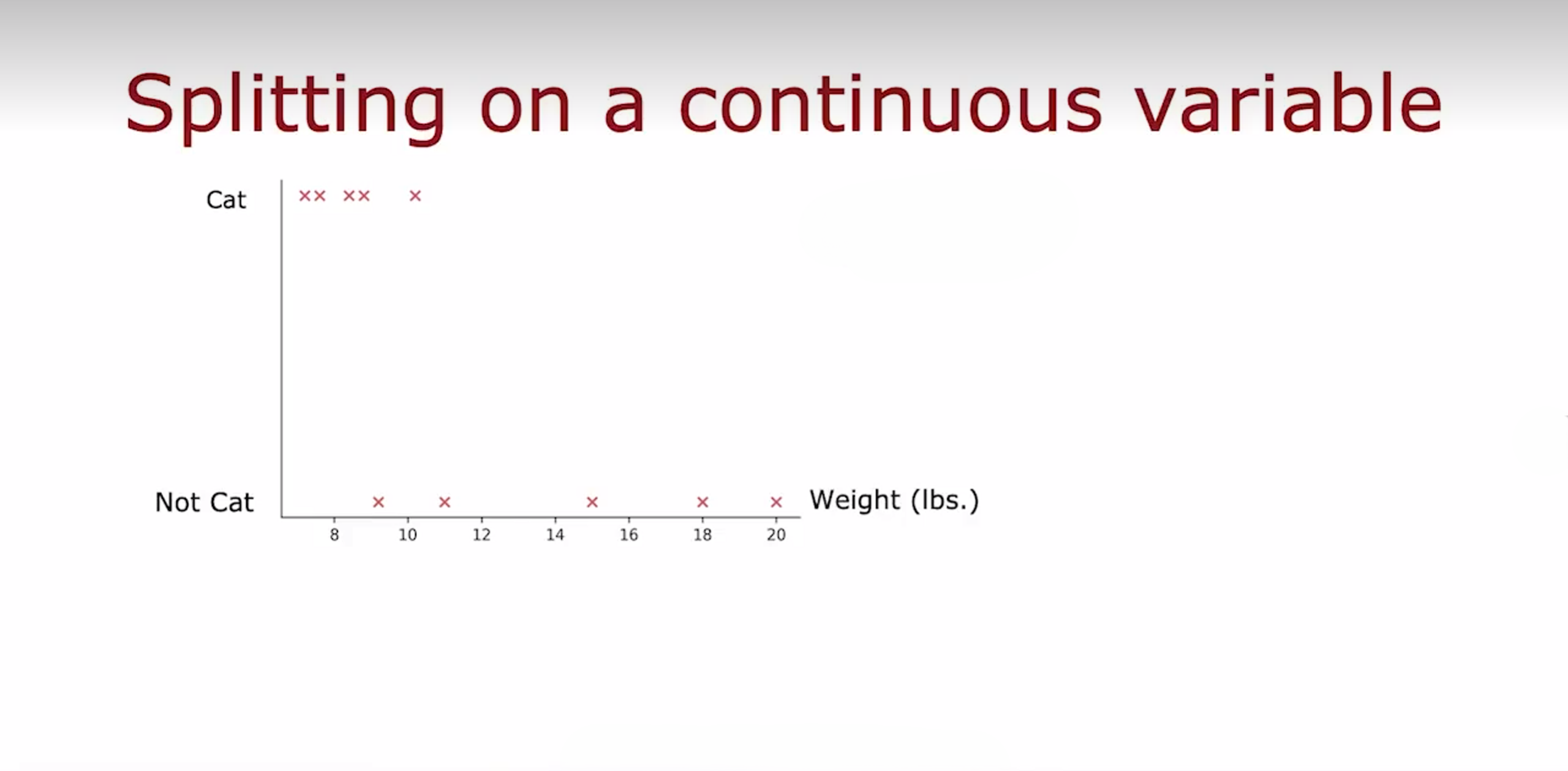 依旧以猫分类模型为例,加入我们现在有一个新的特征:体重,那么我们该如何以体重作为特征值来分裂结点呢?