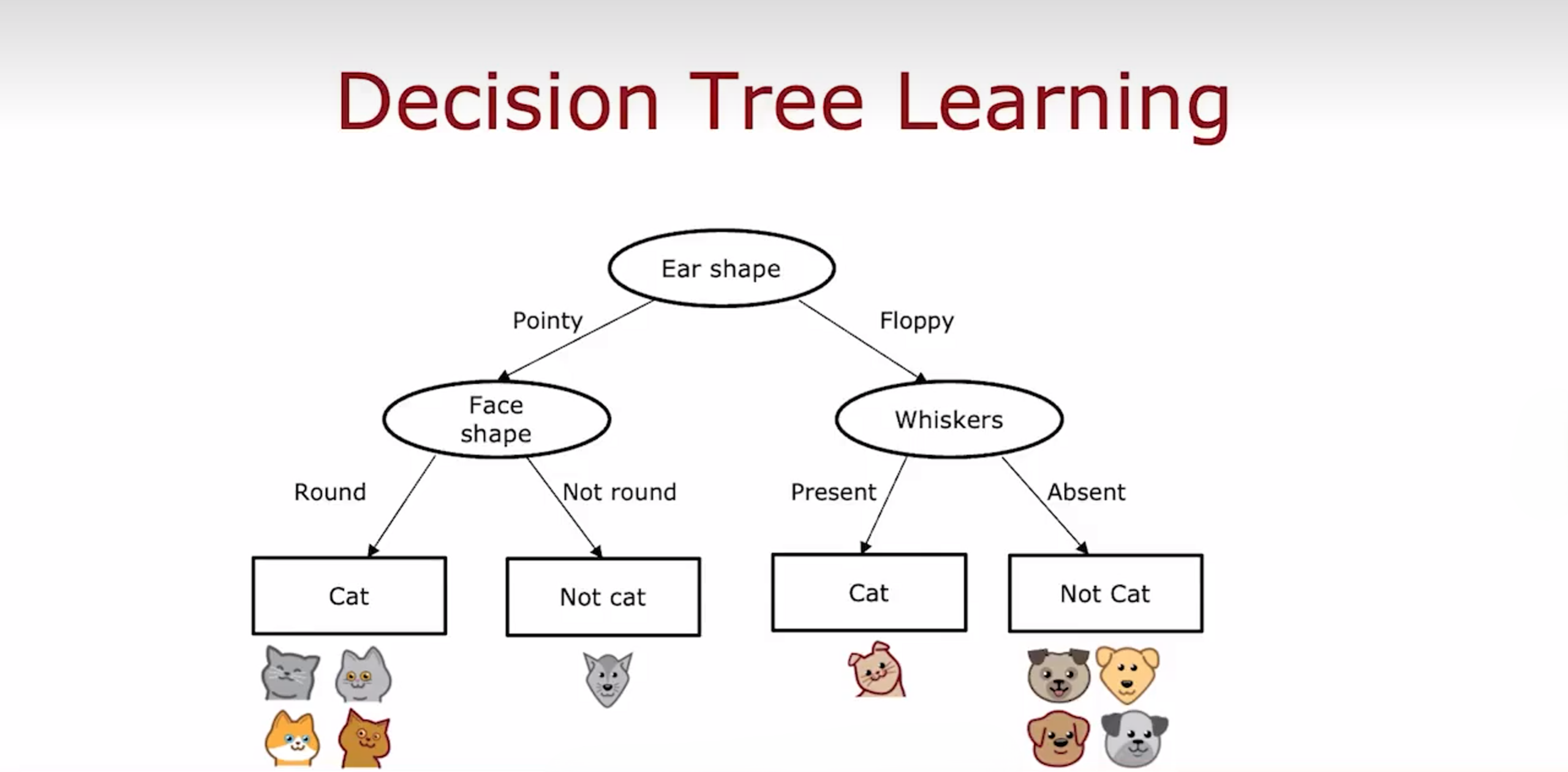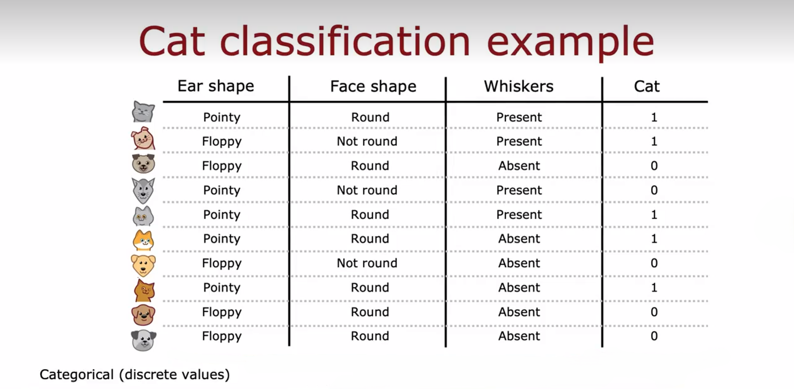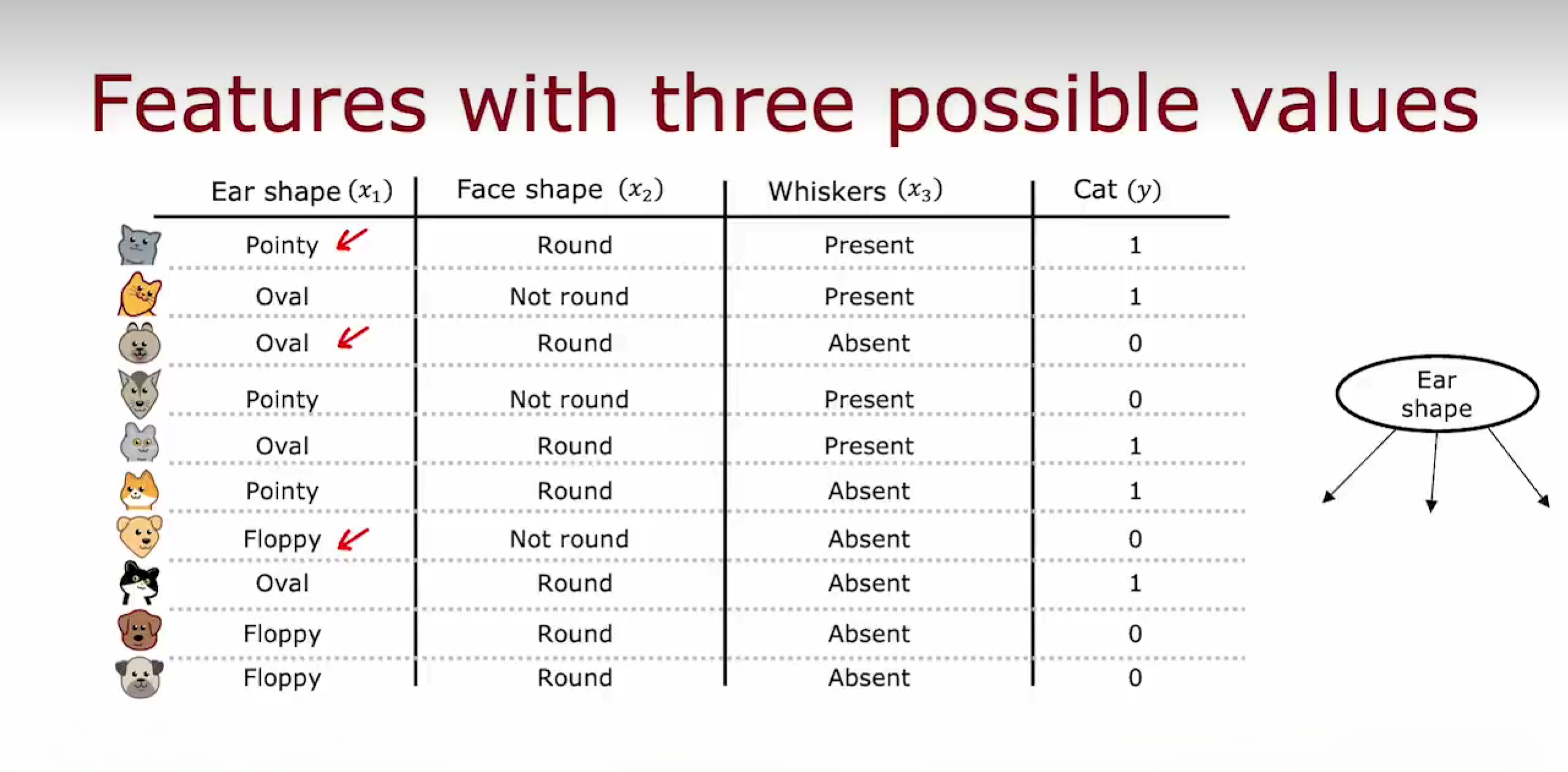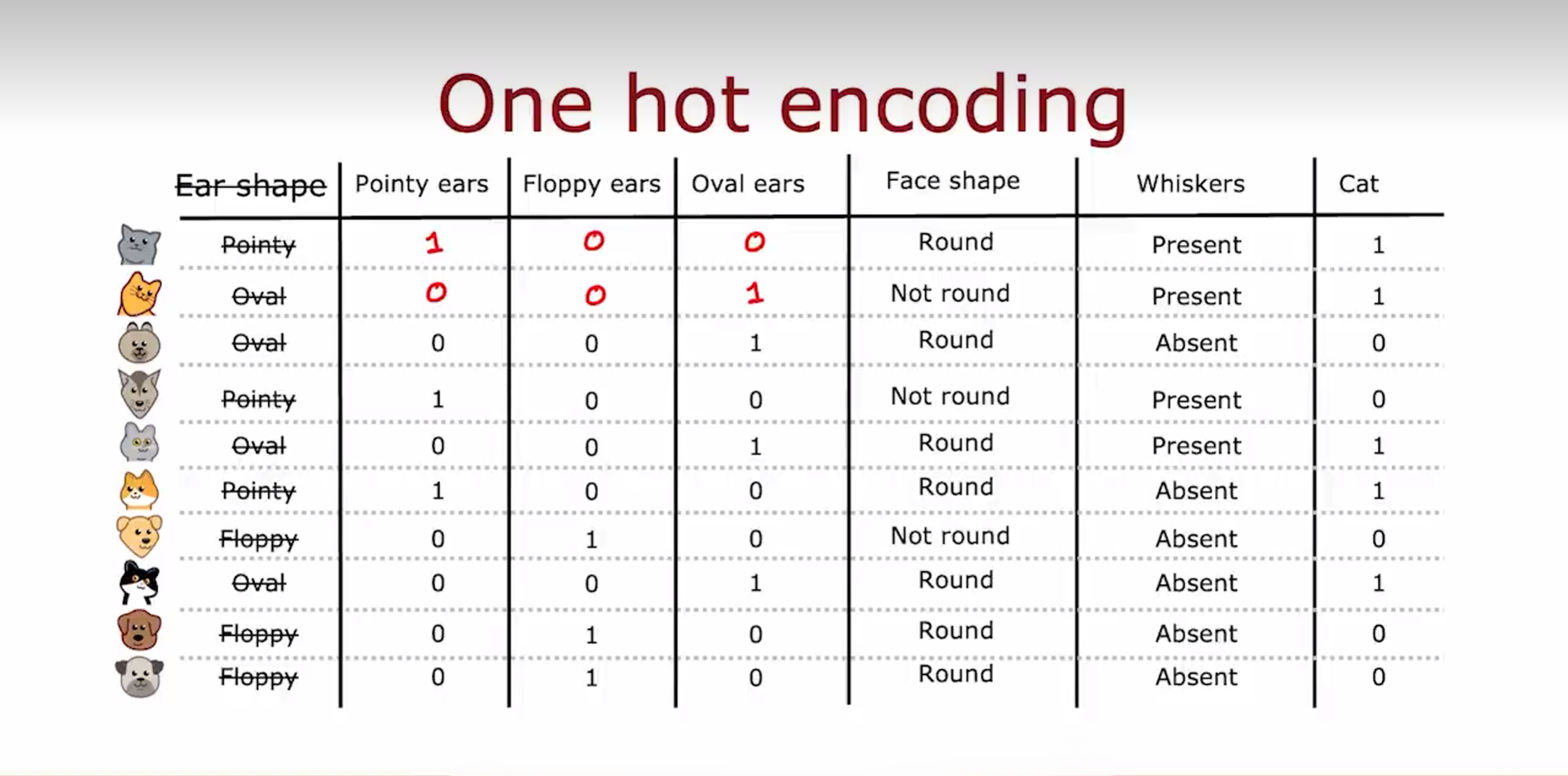 那么通过one-hot编码,我们就可以将其分解为三个特征:有无尖耳、有无圆耳和有无椭圆耳,这样就有变成了之前所学的决策树模型。