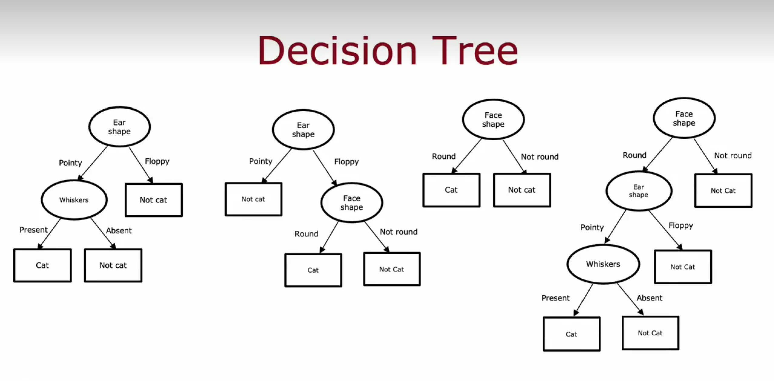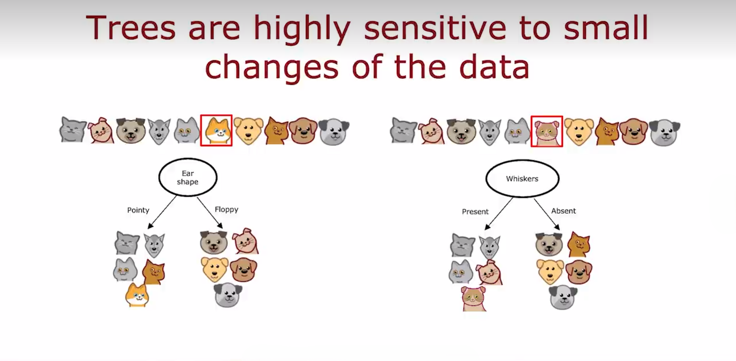 比如我们现在有10个样本,经过计算信息增益,我们选用耳朵形状作为根结点的分裂特征,但是如果我们更换其中一个样本时,就会发现经过重新计算后,有无胡须变成了最适合根结点分裂的特征。我们仅仅更改了一个样本案例就使得整棵决策树变得完全不同,这足以说明单个决策树对数据的改变有多敏感。
