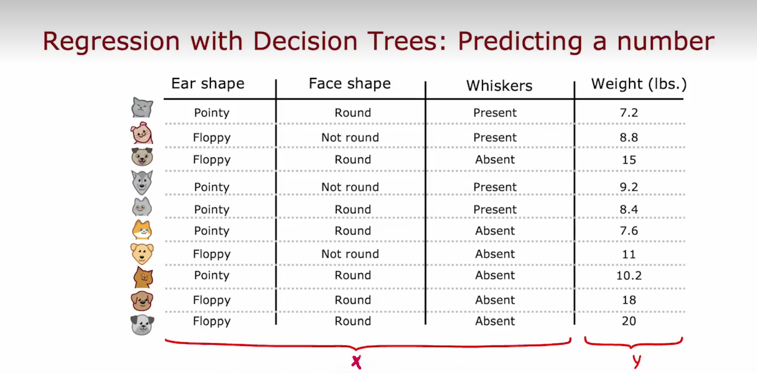 加入我们现在训练集中已知10个样本的四个特征:耳朵形状、脸部形状、有无胡须和体重,现在我们想通过判断前三个特征来预测一个新样本的体重,这时候我们就可以使用回归树。