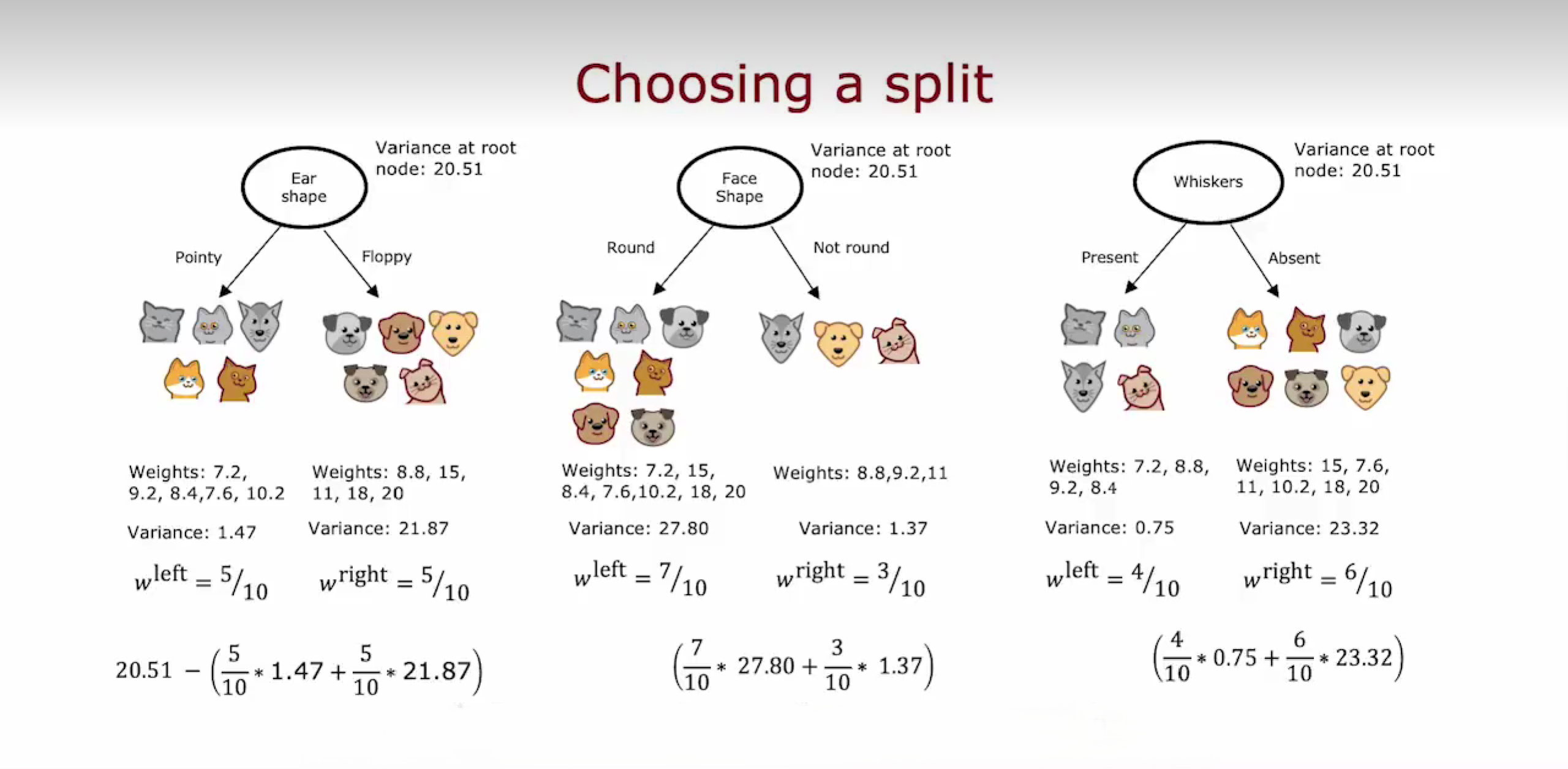与之前的决策树一样,我们可以通过使用不同的特征分裂出不同的决策树,但是我们该如何判断那个是最优的呢?那就是使用平均加权方差。