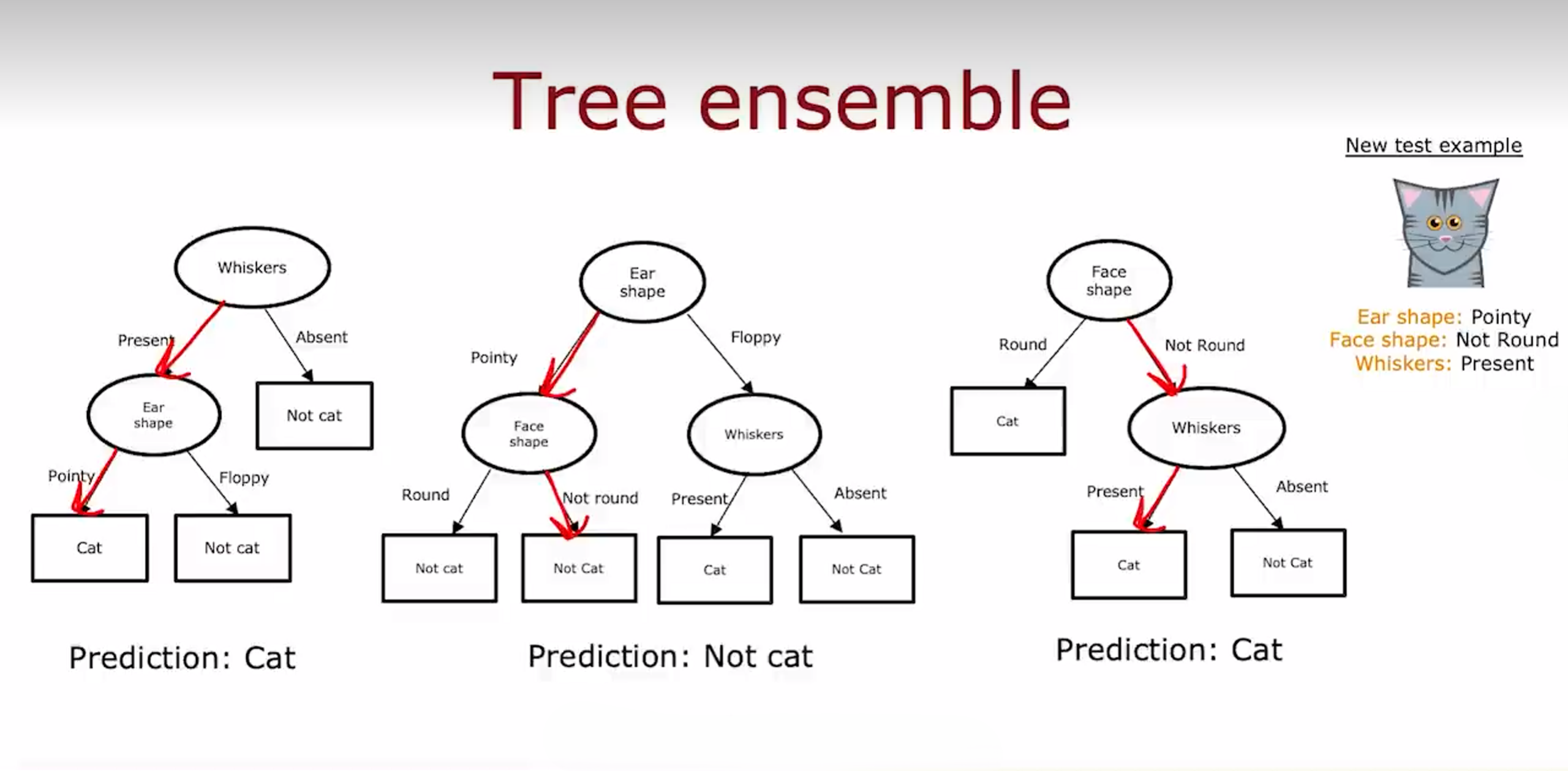第一颗决策树预测结果为猫,第二棵决策树预测结果为非猫,第三棵决策树预测结果为猫,所以最终的预测结果为猫。