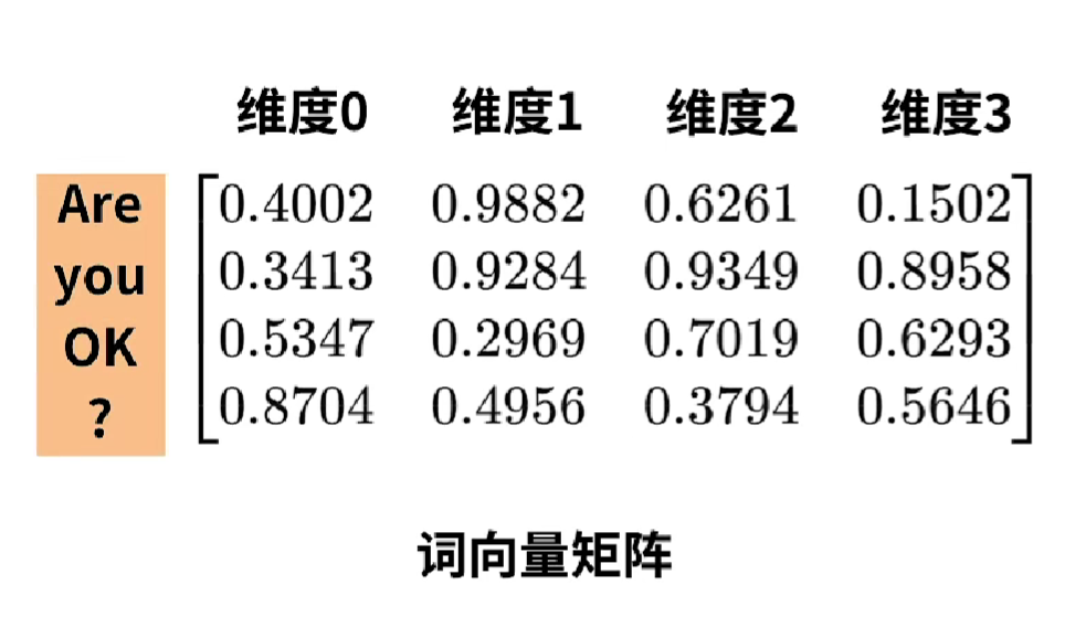 比如我们对于一个简单的句子“Are you OK ?”,这个句子一共包含了四个词,我们假设每个词嵌入的维度为4,那么就会产生一个词嵌入矩阵: