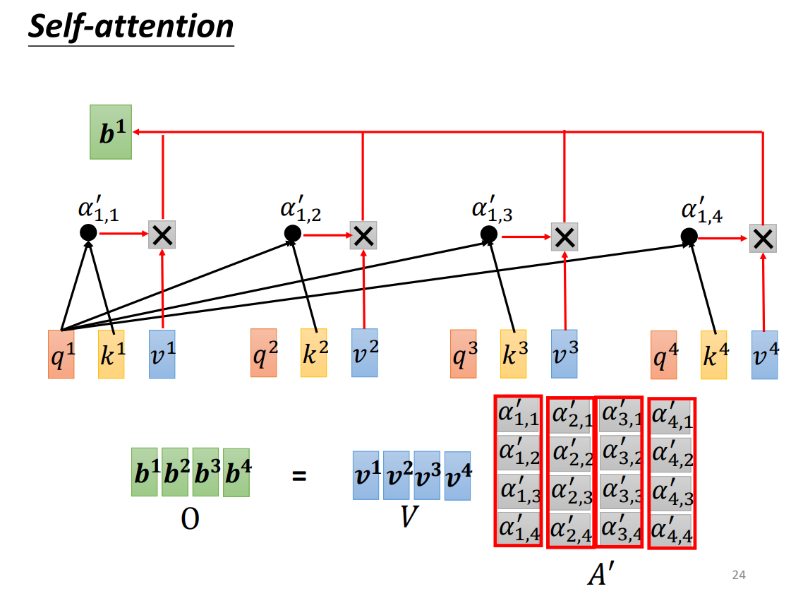 最后的输出b 1 = ∑ i α 1 , i ′ v i b^1 = \sum_i\alpha_{1,i}'v^i b 1 = ∑ i α 1 , i ′ v i ,其中v i = W i a i v^i=W^ia_i v i = W i a i 。其余同理。