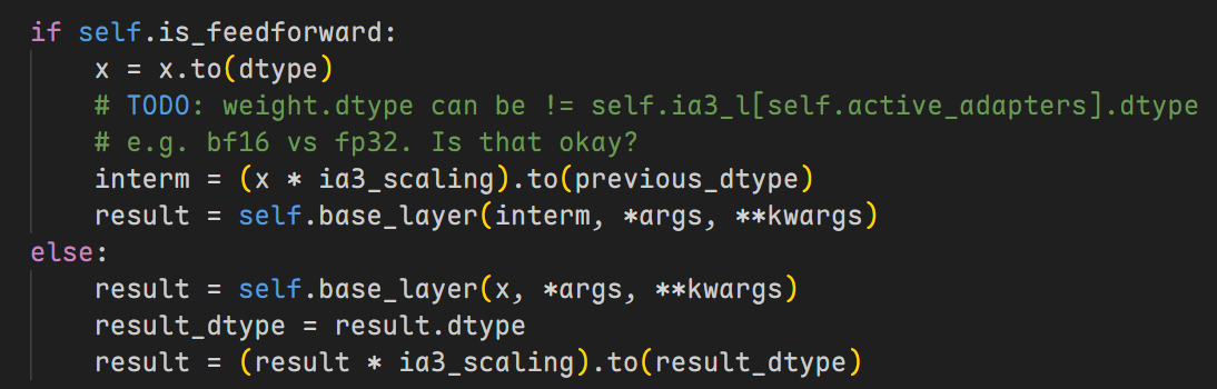 这里IA3在mlp层中的实现方式与图片中的位置不太一样:图片中是在两个dense层之间,但实际上是在第二个dense层中