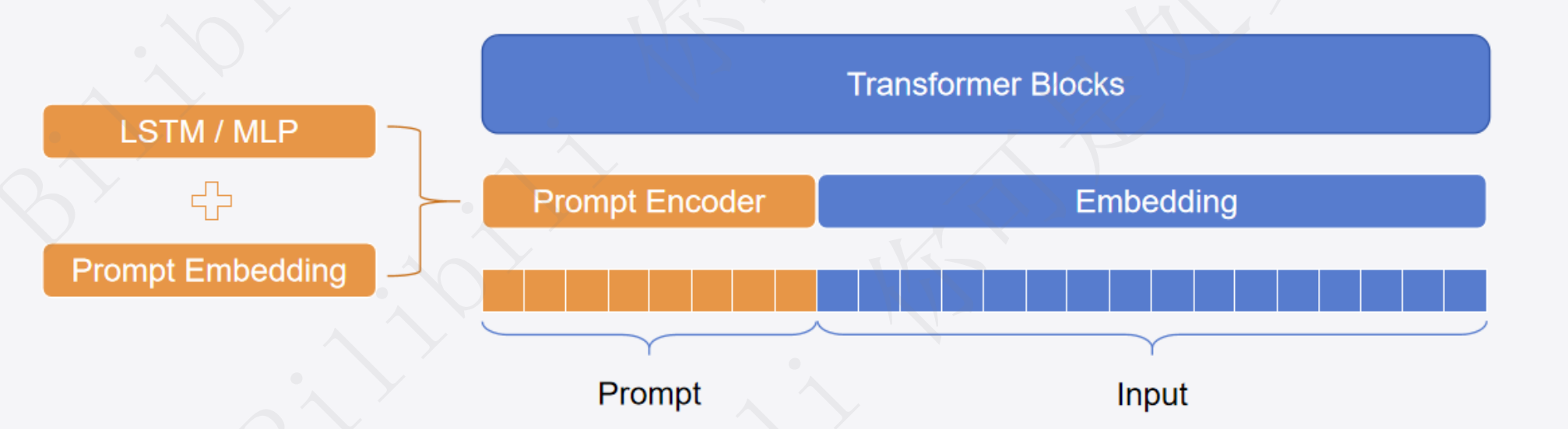 P-Tuning思想:在Prompt-Tuning的基础上,对Prompt部分进行一步的编码计算,加速收敛。具体来说,PEFT中支持两种编码方式,一种是LSTM,一种是MLP。与Prompt-Tuning不同的是,Prompt的形式只有Soft Prompt
