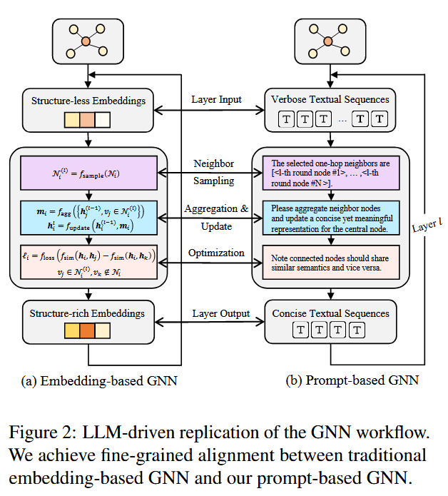 | 信息聚合 | 聚合邻居嵌入 | 用 prompt 引导 LLM 合并邻居文本信息 |