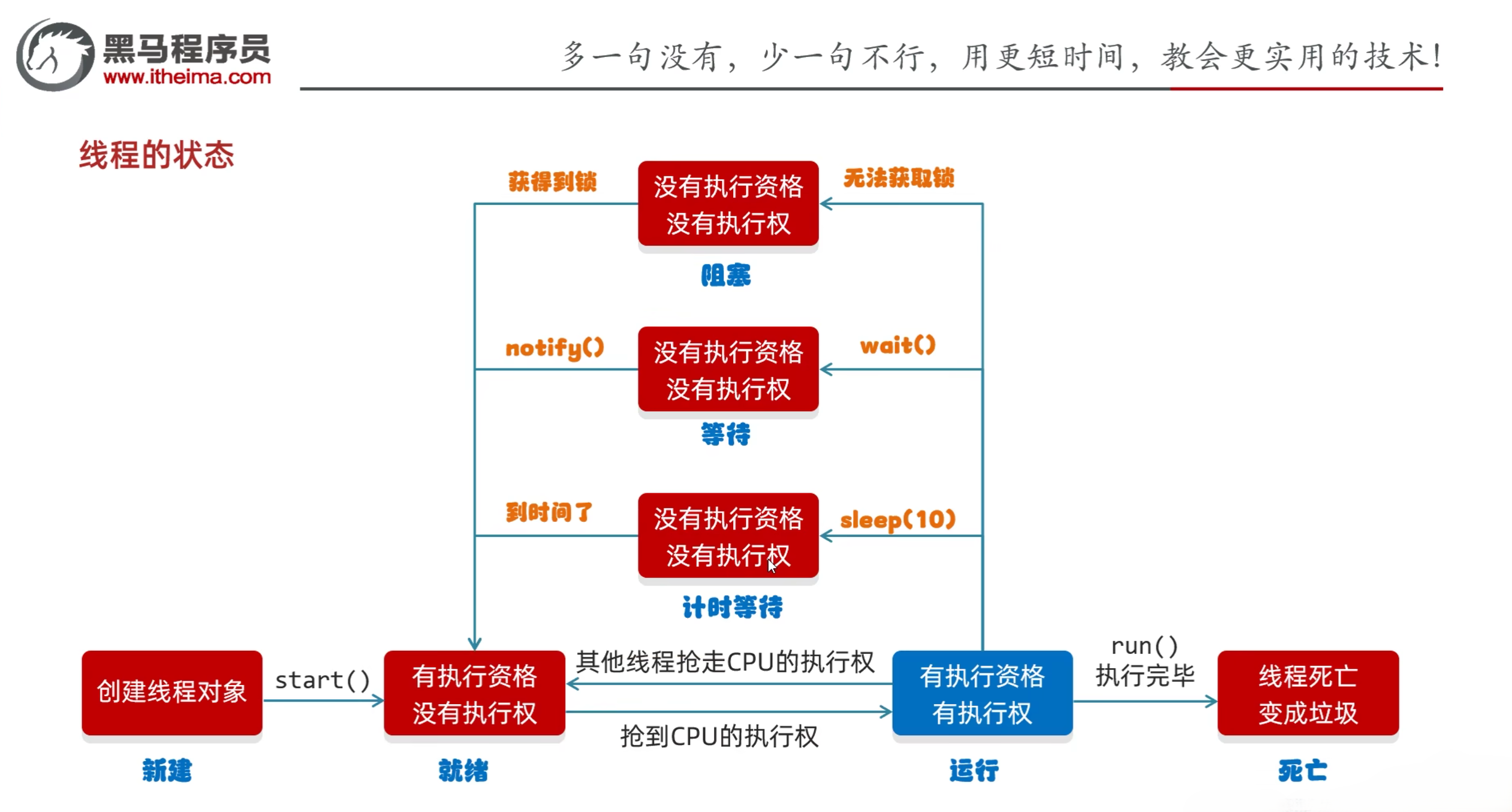 计时等待状态(TIMED_WAITING):调用sleep方法,等待指定时间后自动唤醒
