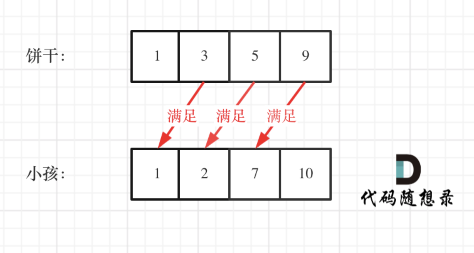 对每个孩子 i,都有一个胃口值 g[i],这是能让孩子们满足胃口的饼干的最小尺寸;并且每块饼干 j,都有一个尺寸 s[j] 。如果 s[j] >= g[i],我们可以将这个饼干 j 分配给孩子 i ,这个孩子会得到满足。你的目标是满足尽可能多的孩子,并输出这个最大数值。