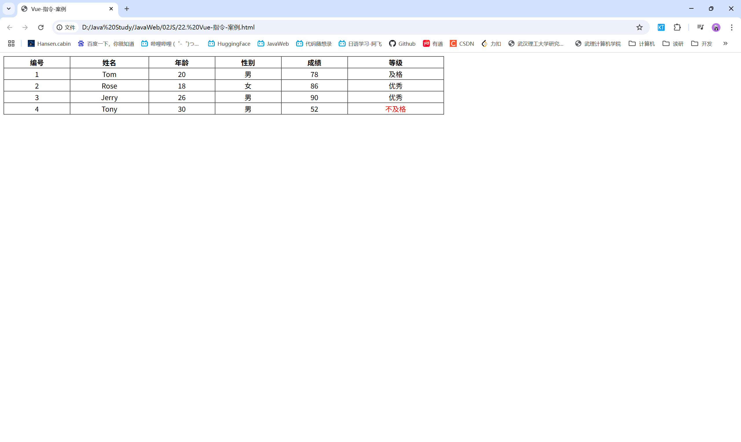 <tr align="center" v-for="(user, index) in users"> <td>{{index + 1}}</td> <td>{{user.name}}</td> <td>{{user.age}}</td> <td> <span v-if="user.gender == 1">男</span> <span v-if="user.gender == 2">女</span> </td> <td>{{user.score}}</td> <td> <span v-if="user.score >= 85">优秀</span> <span v-else-if="user.score >= 60">及格</span> <span style="color: red;" v-else>不及格</span> </td> </tr> </table>