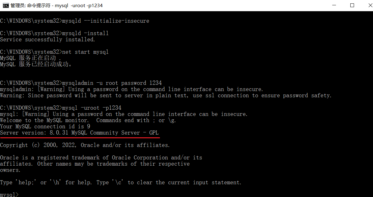 在黑框中输入,mysql -uroot -p1234,回车,出现下图且左下角为mysql>,则登录成功。