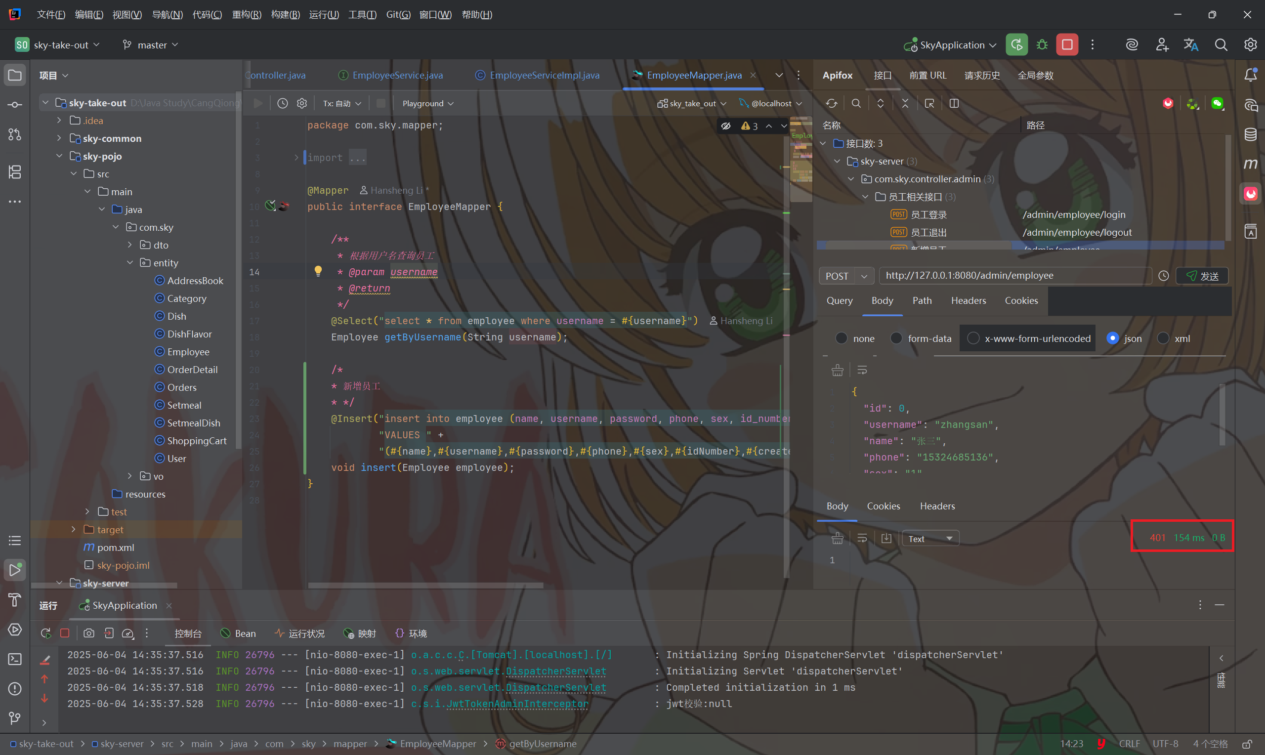 - 问题:返回401,原因是未登录,所以在测试过程中jwt令牌校验不通过
