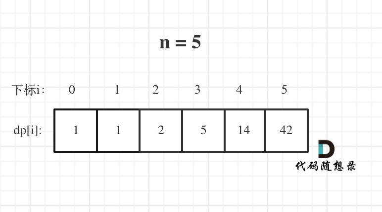 因此递推公式为:dp[i] = dp[0] * dp[i - 1] + dp[1] * dp[i - 2] + … + dp[i - 1] * dp[0] -
