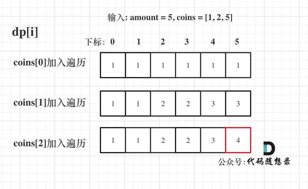 所以递推公式为dp[i][j] = dp[i-1][j] + dp[i][j - coins[i]]