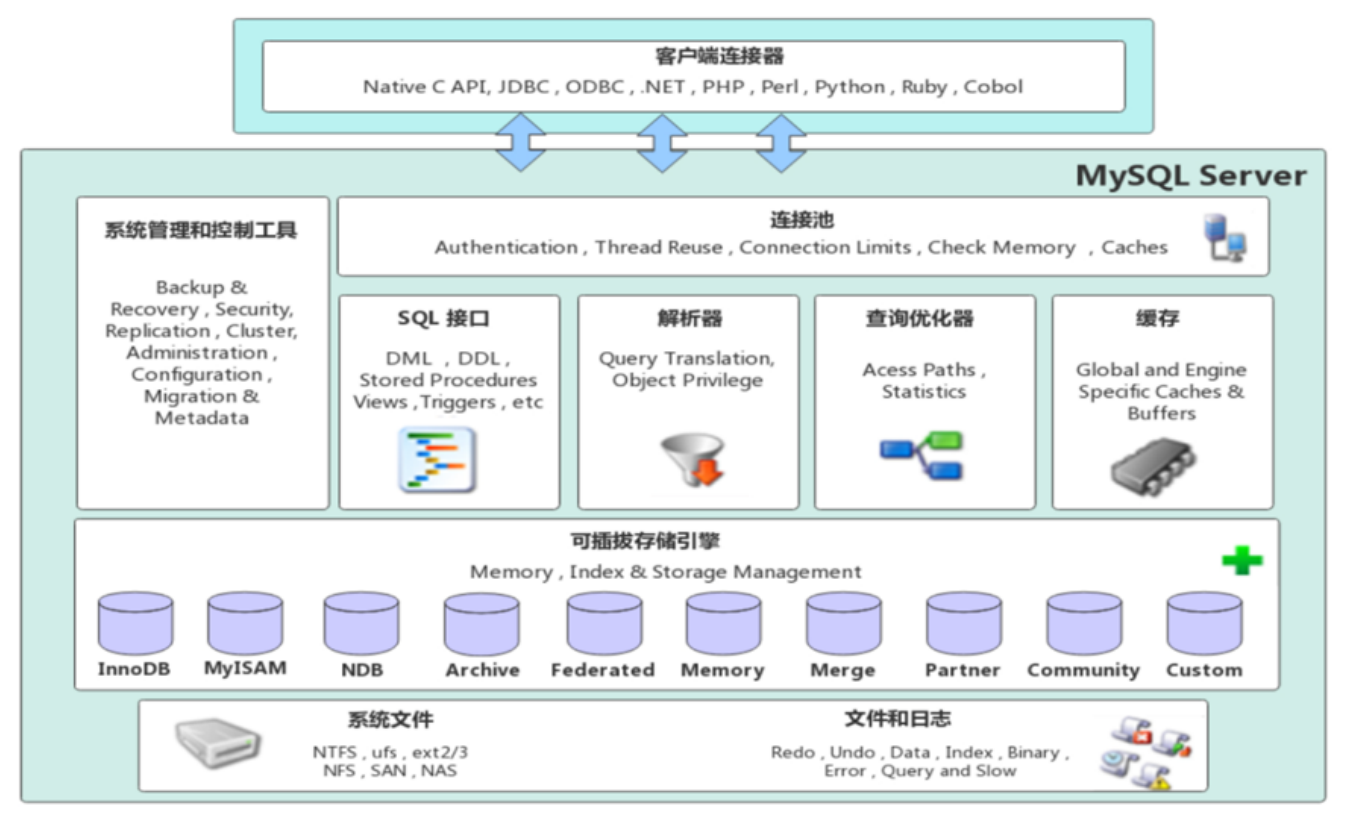 - 存储层:主要是将数据存储在文件系统之上,并完成与存储引擎的交互。