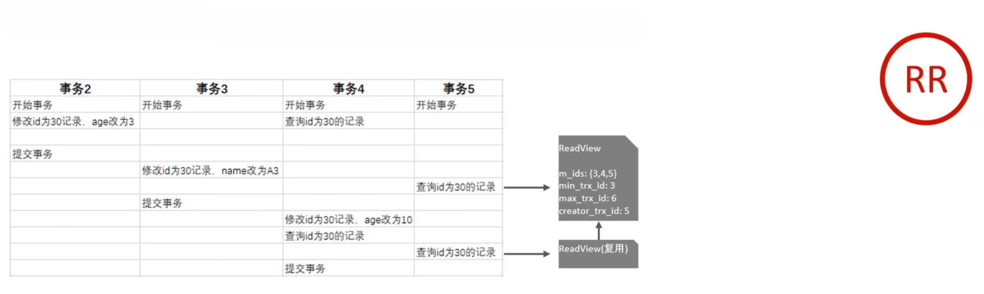 - RR隔离级别下,仅在事务中第一次执行快照读时生成ReadView,后续复用该ReadView。而RR是可重复读,在一个事务中,执行两次相同的select语句,查询到的结果是一样的。