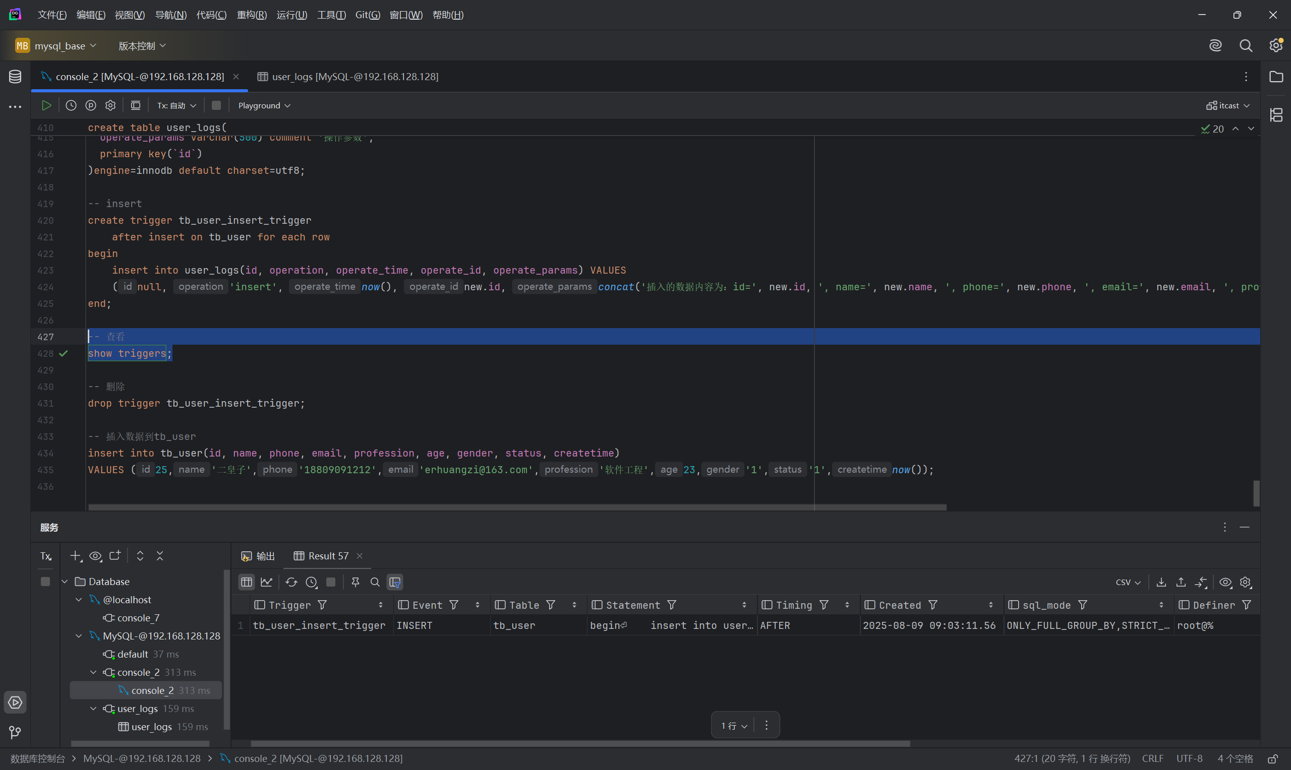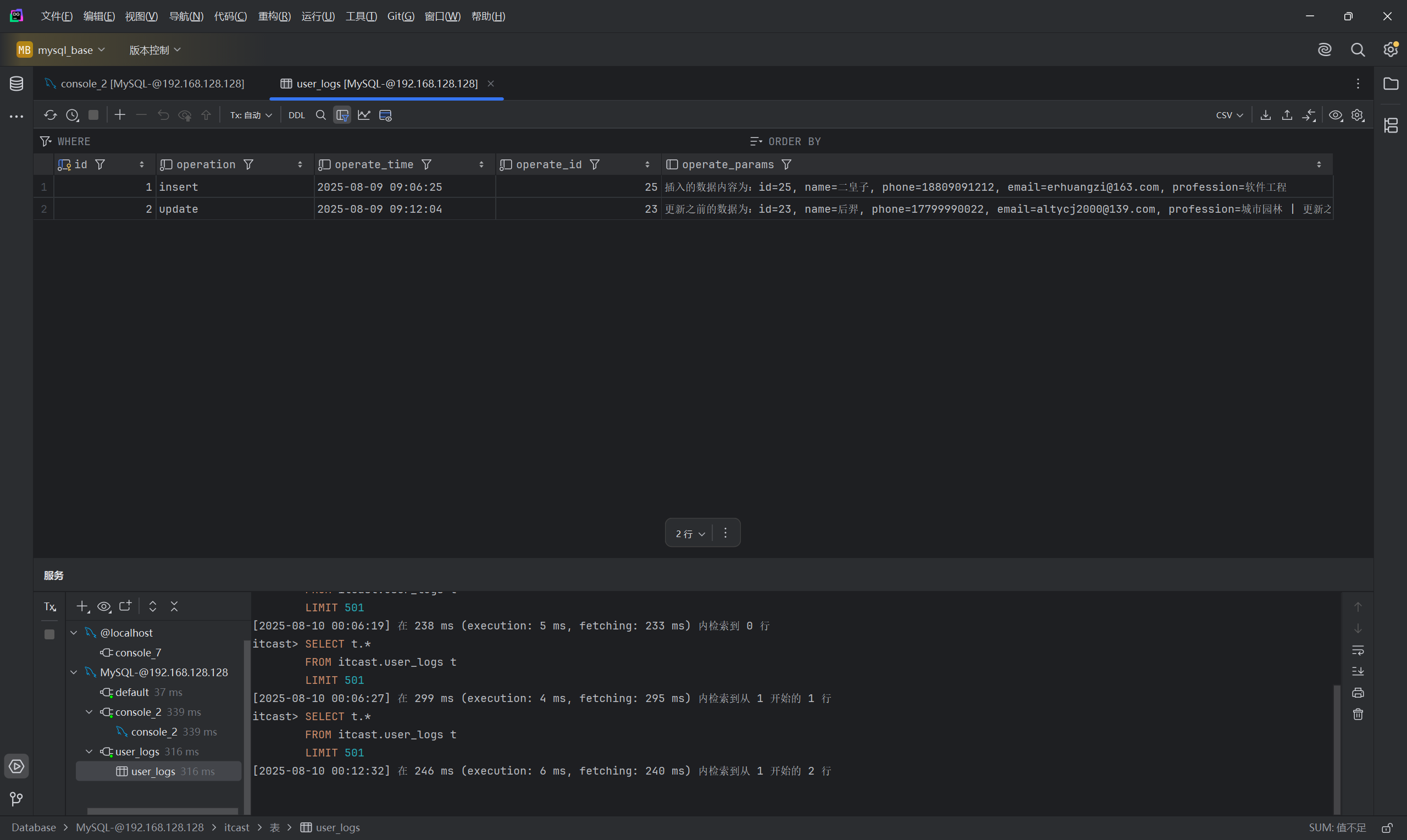 当前读:读取的是记录的最新版本,读取时还要保证其他并发事务不能修改当前记录,会对读取的记录进行加锁。对于我们日常的操作,如:select … lock in share mode(共享锁),select … for update、update、insert、delete(排他锁)都是一种当前读。