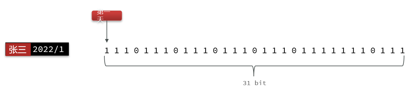 把每一个bit位对应当月的每一天,形成了映射关系。用0和1标示业务状态,这种思路就称为位图(BitMap)。
