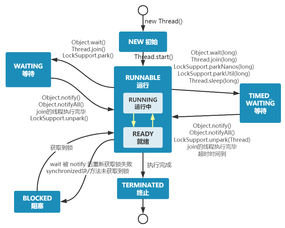 Ready和Running两个状态,在JVM层面,只能看到Runnable状态,这是因为现在的操作系统基本上都是使用“时间分片”方式进行抢占式轮转调度,而时间分片通常都很小,线程切换太快,区分这两种状态就没意义了