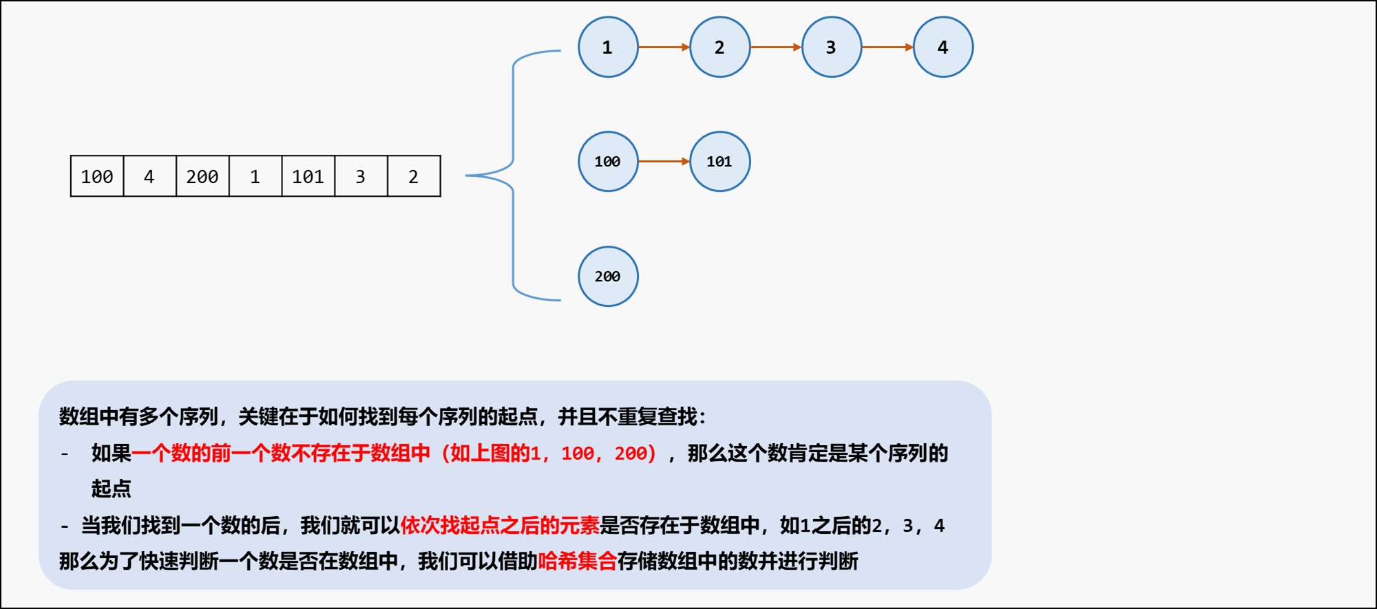 • 对于数组中存在的连续序列,为了统计每个连续序列的长度,我们希望直接定位到每个连续序列的起点,从起点开始遍历每个连续序列,从而获得长度。