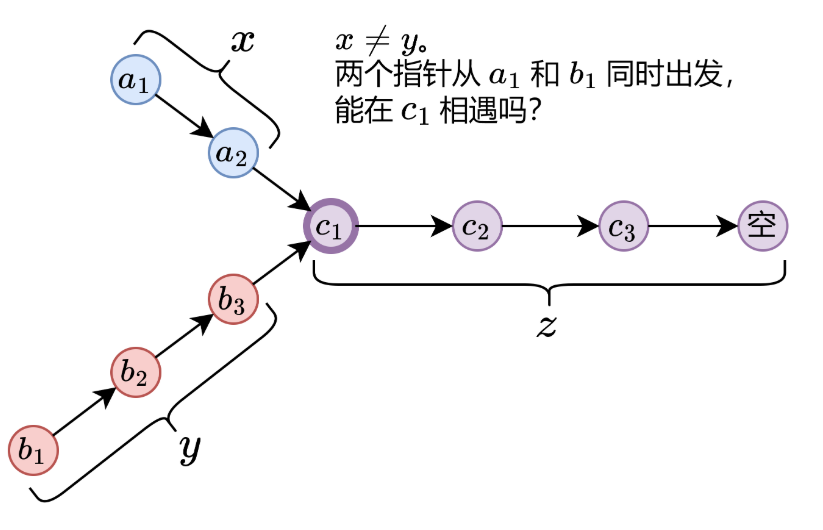 - 设第一条链表长度为x + z,第二条链表长度为y + z,其中z为两链表相交部分的长度。